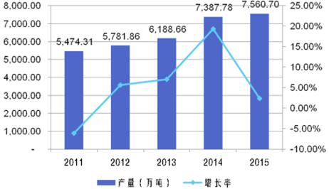 2011-2015 年我國塑(sù)料制品産量及(ji)增長率情況